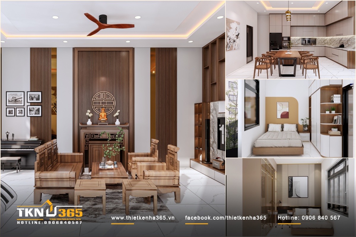 Trong biệt thự phố 2 tầng, phòng khách giữ vai trò trung tâm kết nối. Bộ bàn ghế gỗ kiểu dáng truyền thống và bàn thờ gia tiên xử lý với tỷ lệ hình khối chuẩn mực, gợi cảm giác trang nghiêm mà không nặng nề. Lam gỗ chạy dọc mảng tường lớn làm tăng chiều sâu, tạo bầu không khí ấm cúng và thân thuộc. Trong phòng khách, gia chủ dành góc nhỏ để đặt đàn piano và ghế massage, thêm không gian thư giãn thoải mái cho cả gia đình.