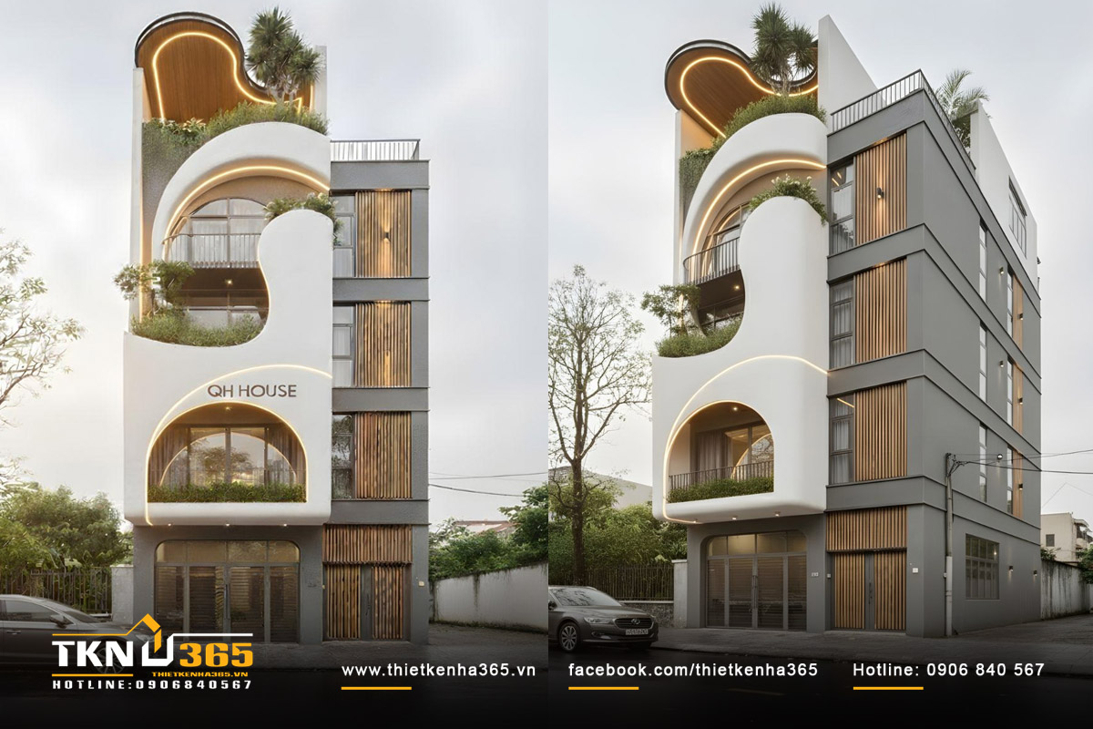 Mặt tiền nhà phố 5 tầng QH’s House kết hợp giữa đường cong mềm mại và khối hộp hiện đại. Những đường bo tròn uốn lượn được nhóm kiến trúc sư của Thiết Kế Nhà 365 xử lý như “làn sóng” chuyển động xuyên suốt từ tầng trệt đến mái. Nhờ ý tưởng thiết kế này, tổng thể nhà phố gợi cảm giác nhẹ nhàng và uyển chuyển, đồng thời thể hiện rõ sự khác biệt so với những công trình xung quanh.