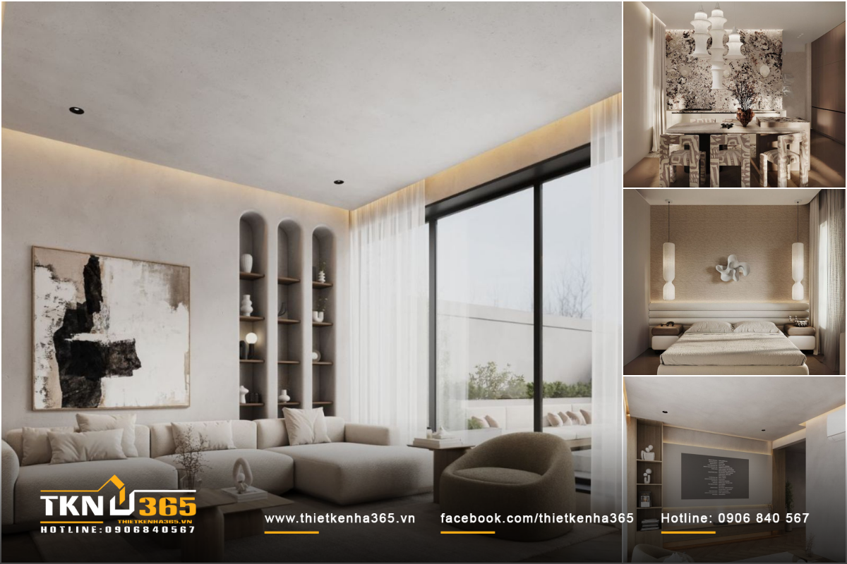 Phòng khách sử dụng sofa vải gam màu trung tính cùng bàn trà bằng gỗ nhỏ gọn. Xuyên qua lớp rèm voan trắng, ánh sáng khuếch tán nhẹ giúp không gian trở nên mềm mại. Các chi tiết trang trí như tranh trừu tượng, lọ gốm thủ công, ánh sáng âm tường được sắp đặt vừa đủ, tạo hiệu ứng chiều sâu thị giác mà không rườm rà.